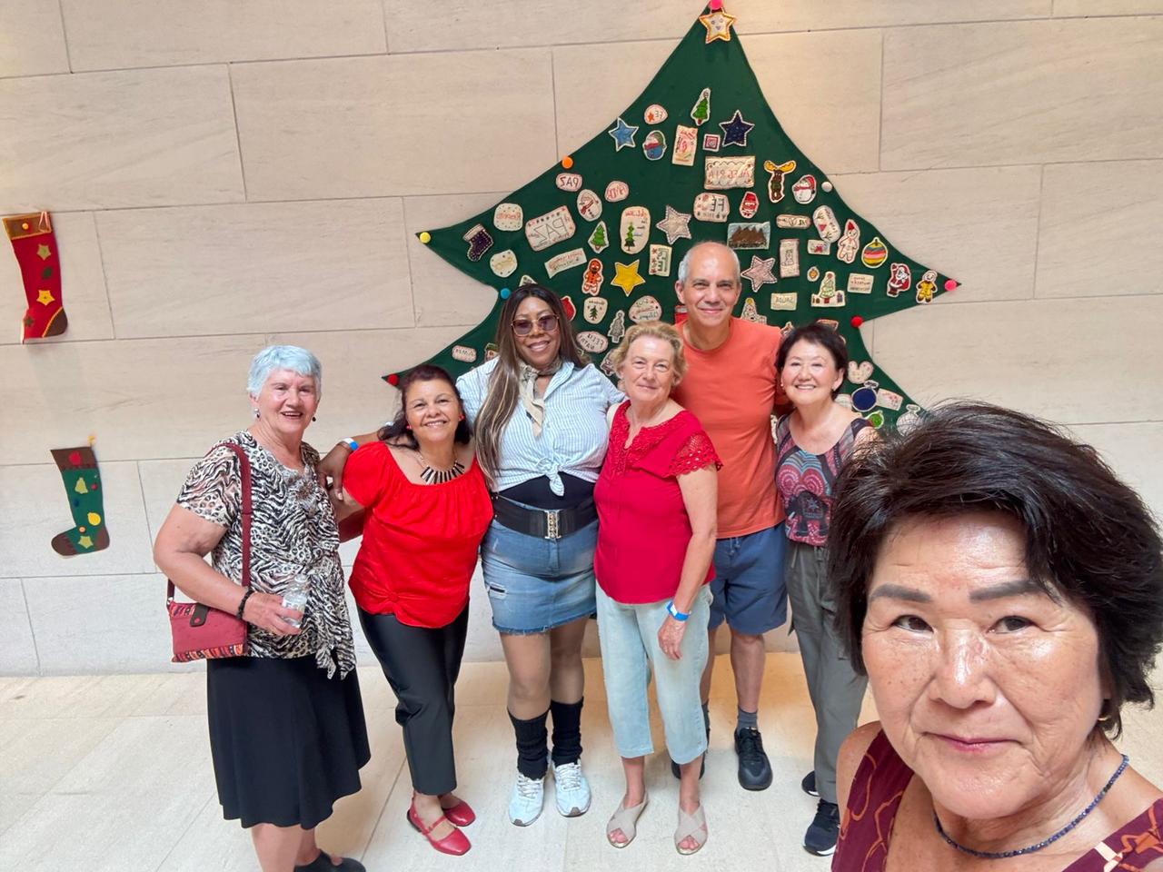 A celebração começou por volta das 11h, com uma mesa farta de bolos, tortas, sanduíches, panetones e outras delícias típicas natalinas. No mezanino, que virou pista de dança, os participantes foram se soltando ao som de músicas vibrantes como Sandra Rosa Madalena, de Sidney Magal, “Estúpido Cupido”, clássico de Celly Campello, entre outros. Em seguida, os alunos apresentaram lindas coreografias ensaiadas na aula de ritmos, dança e dança circular.